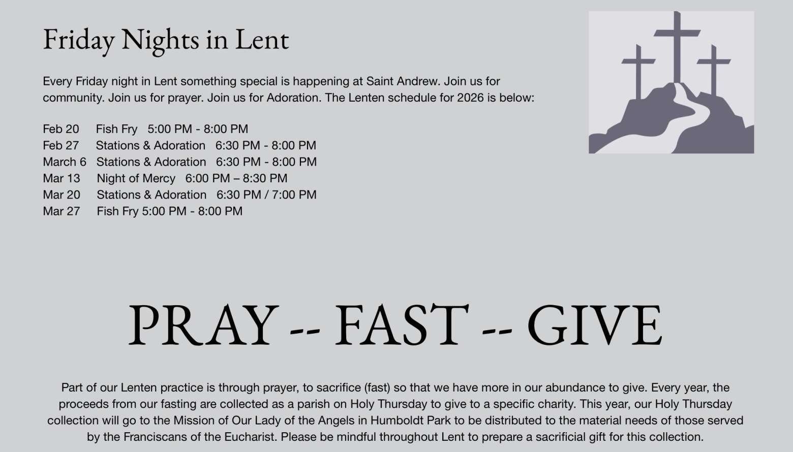 2nd Grade First Communion (ONLY) Religious Education program will meet this Sunday, February 22, 2026 from 10:00am—10:50am at Saint Andrew School.